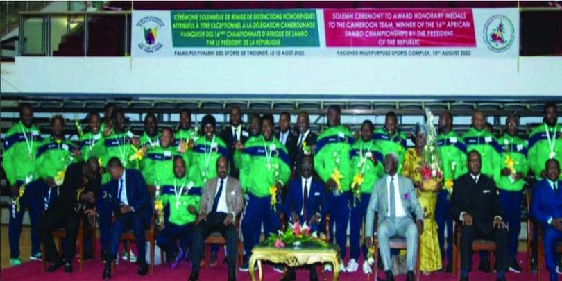 à l’occasion de la cérémonie solennelle de remise des distinctions honorifiques à titre exceptionnel à la délégation camerounaise, vainqueur du 16ème championnat d’Afrique de Sambo, des médailles du mérite sportif et chevalier du mérite camerounais ont été décernés aux athlètes et membres de la « team Cameroun » ayant produit ce résultat fort appréciable. Ces valeureux compatriotes ont dominé leurs adversaires au cours de cette compétition continentale en juillet dernier au Paposy. Les poulains de Me Mbassi Prospère ont terminé la compétition avec un bilan de 16 médailles remportées donc 08 en d’Or ; se hissant ainsi sur la plus haute marche du podium, pour faire retentir pas moins de 8 fois l’Hymne National du Cameroun, à la plus grande satisfaction des athlètes(Héros) et de leurs compatriotes.