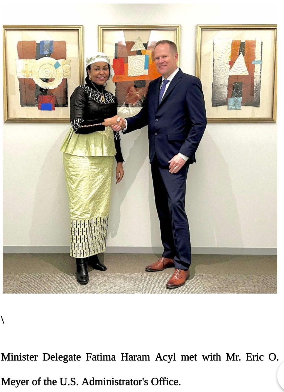 - United States: Mrs. Fatima Haram Acyl met with Mr. Eric O. Meyer of the U.S. Administrator’s Office, securing reaffirmation of U.S. support for Chad’s programs and the “Chad Connection 2030” plan.