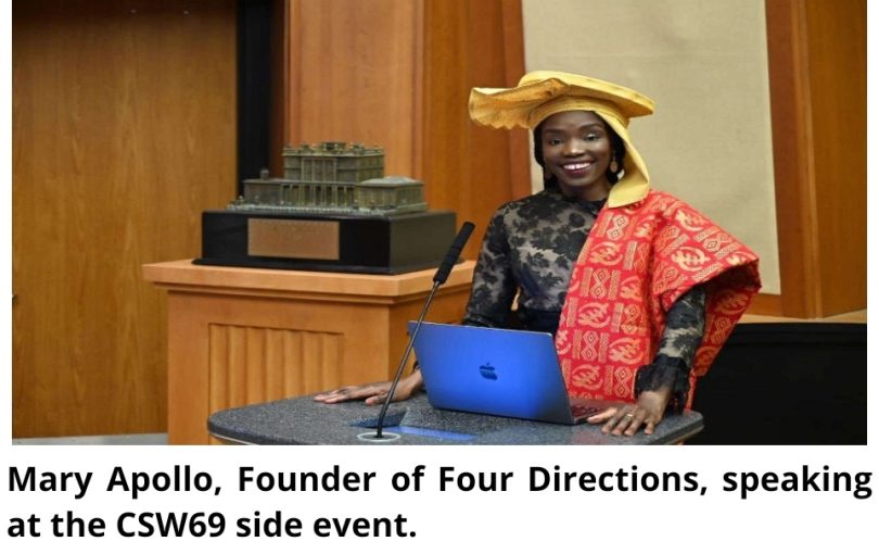 Mary Apollo highlighted the resilience of women in refugee camps across Sudan, Mali, and Nigeria, acknowledging their efforts to improve their families’ and communities’ quality of life. She shared the origins of her initiative, which began in 2024, with a vision of strengthening women’s leadership through education and self-empowerment. In collaboration with young African women and Cornerstone Mount Group, she submitted a proposal to the UN Commission on the Status of Women, advocating for quality education and economic opportunities for women in conflict zones as well as the need for environmental health considerations.