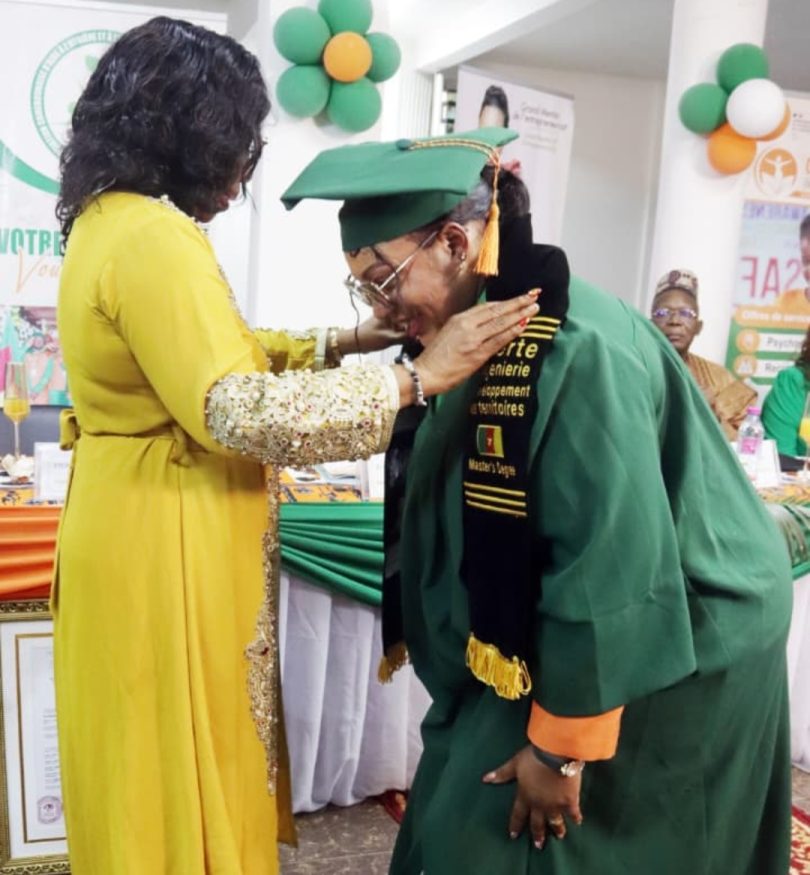 La master class a été le cadre d’une double consécration. Sur le plan académique, Yvonne Flore Belema s’est vue remettre officiellement son diplôme de Master II en Ingénierie du développement des territoires, obtenu à l’IHEGTD sous la tutelle de l’Université de Dschang. Un parcours qu’elle a mené de front avec ses activités entrepreneuriales, soutenant même un mémoire sur la gestion des déchets au Cameroun.