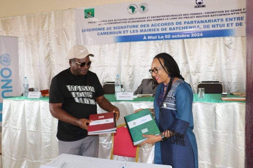 L’Hôtel Les Chutes de Ntui, a abrité ce 02 Octobre, la signature d’accords de partenariats entre ONU FEMMES Cameroun et les mairies de Batchenga et de Ntui. Cette cérémonie symbolique s’inscrit dans le cadre du Projet d’appui aux activités spécifiques et entrepreneuriales des femmes le long du projet routier Batchenga-Ntui-Yoko-Lena, visant à promouvoir l’autonomie économique des femmes dans la région du Centre.