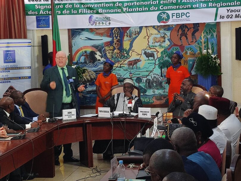 Une importante cérémonie de Signature de Convention entre l’Association Nationale des Acteurs de la Filière Banane-Plantain du Cameroun -FBPC- et La Régionale Bank du Cameroun s’est tenue ce 2 mai à Yaoundé sous la houlette du ministre de l’agriculture et du développement rural Gabriel Mbairobe. Dans une démarche visionnaire pour l’agriculture camerounaise, l’Association Nationale des Acteurs de la Filière Banane-Plantain du Cameroun (FBPC) et La Régionale Bank du Cameroun ont signé ce 02 Mai, une convention qui promet de transformer le paysage économique du secteur, marquant le début d’une ère nouvelle pour l’agro-industrie nationale.