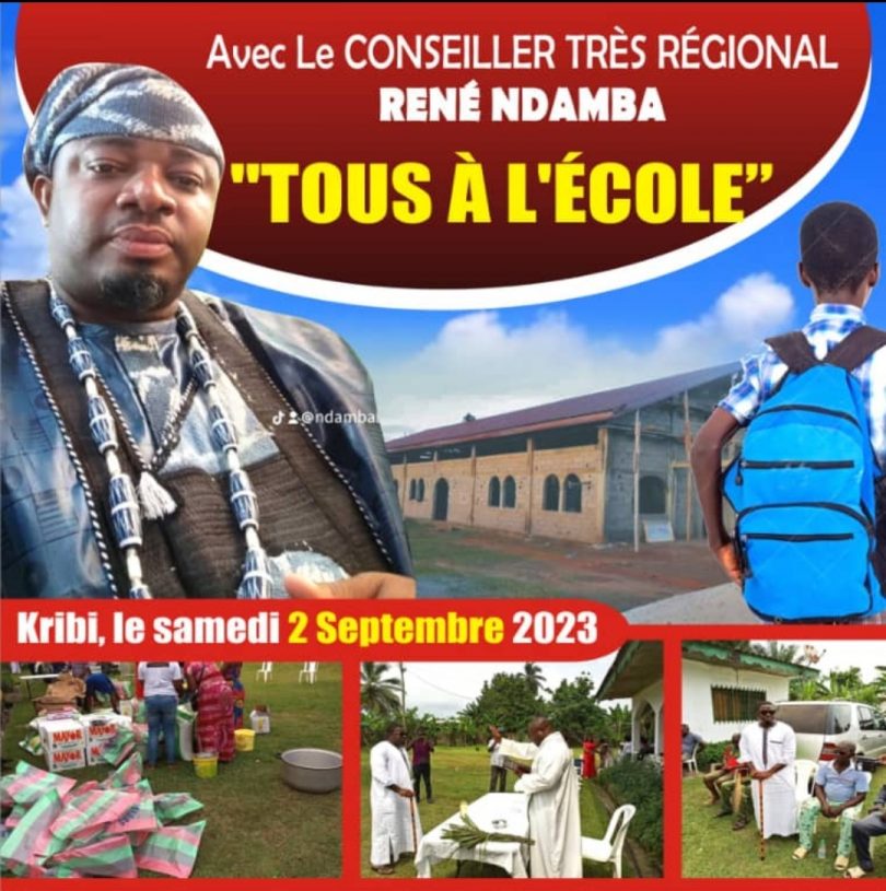 Le Conseiller Très Régional du Sud René NDAMBA organise ce samedi 2 Septembre 2023 dans la Cité Balnéaire de l’Océan à Kribi, la Première Édition de l’opération inédite de Promotion de l’Excellence Scolaire baptisée “TOUS À L’ÉCOLE”.