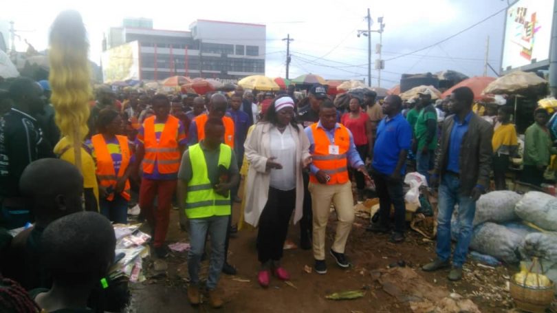 Au carrefour Etoudi, à proximité du Marché le Minhdu constate avec amertume le blocage par des commerçants, de la route devenue impraticable depuis plusieurs semaines («le 28 Mai 2023, cette route a été bloquée par les des vendeurs à la sauvette comme vous le constatez à cause de son impraticabilité… »,  déclare un commerçant désabusé). Mme Célestine Kétcha Courtès est escortée sur ce site encombré par le Chef  Service  Technique de la Mairie de Yaoundé 1er qui lui explique méticuleusement la situation sur le terrain en présence d’une importante foule de commerçants. Ces derniers, enchantés par la visite de Mme le Ministre, poussent des cris de joie et applaudissent après des précisions et l’assurance  qu’elle donne à propos de l’imminente des travaux de réhabilitation de cette route qui dessert le marché.