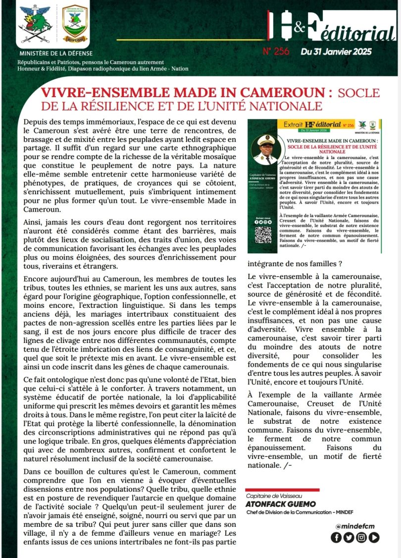 À l’exemple de la vaillante Armée Camerounaise, Creuset de l’Unité Nationale, faisons du vivre-ensemble, le substrat de notre existence commune. Faisons du vivre-ensemble, le ferment de notre commun épanouissement. Faisons du vivre-ensemble, un motif de fierté nationale. /-